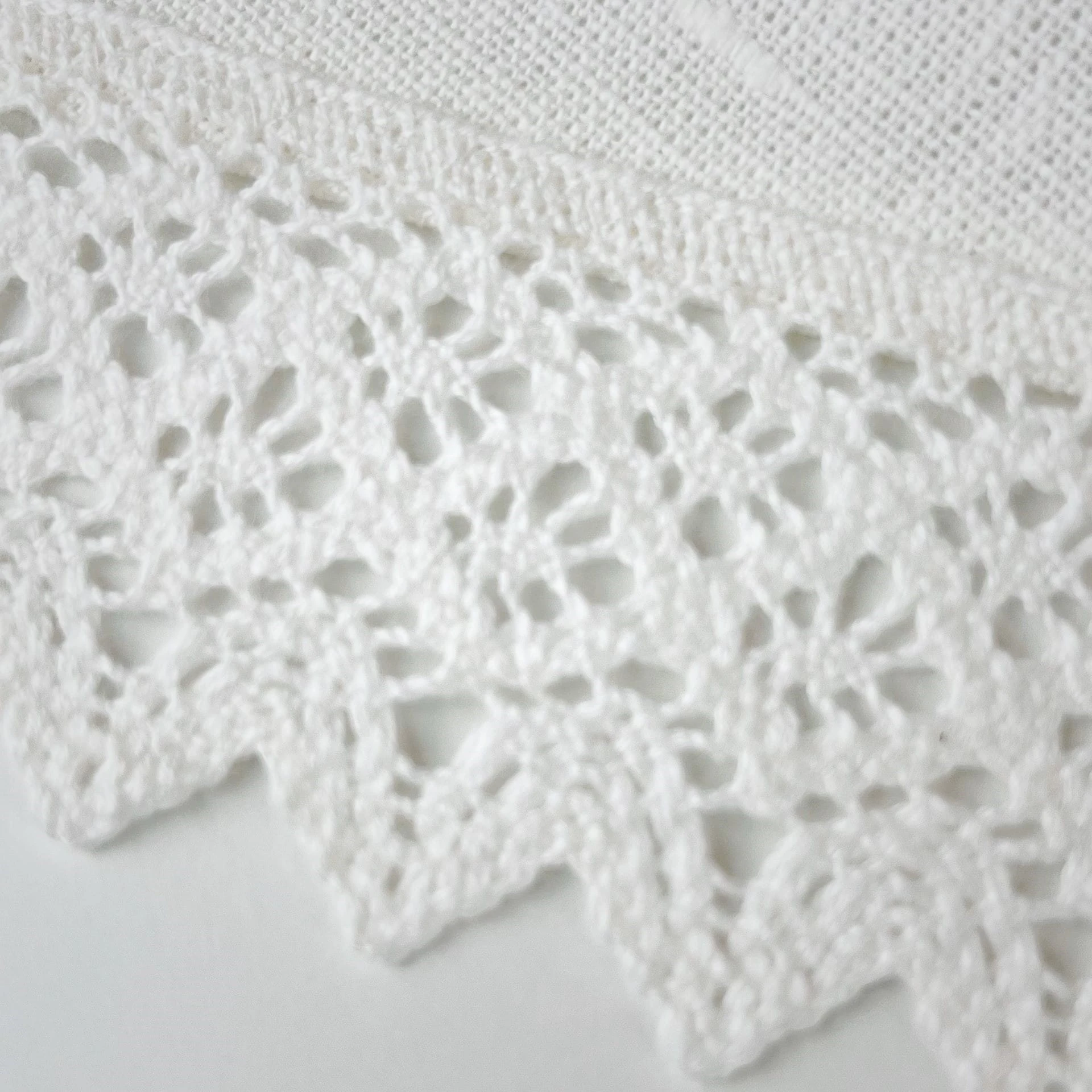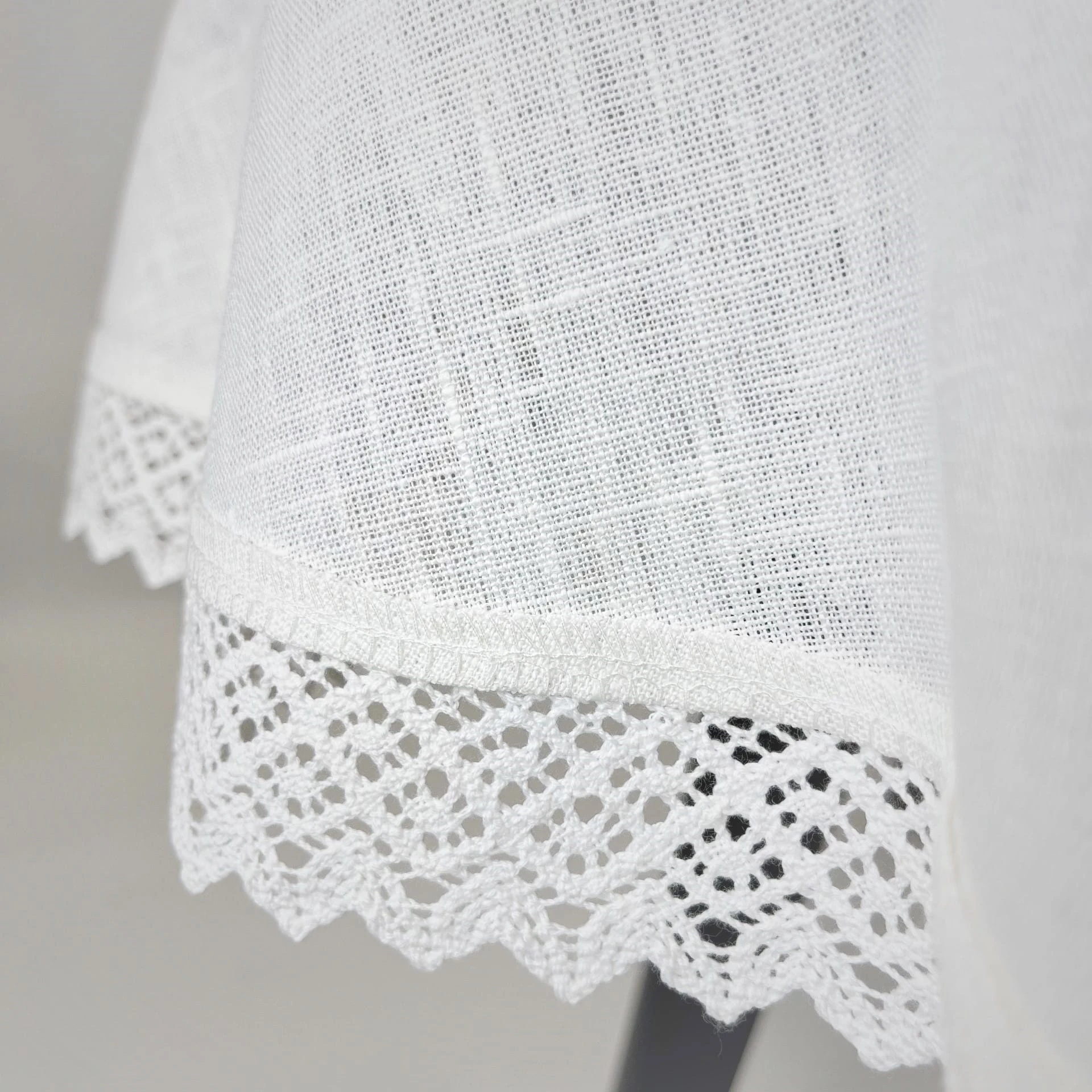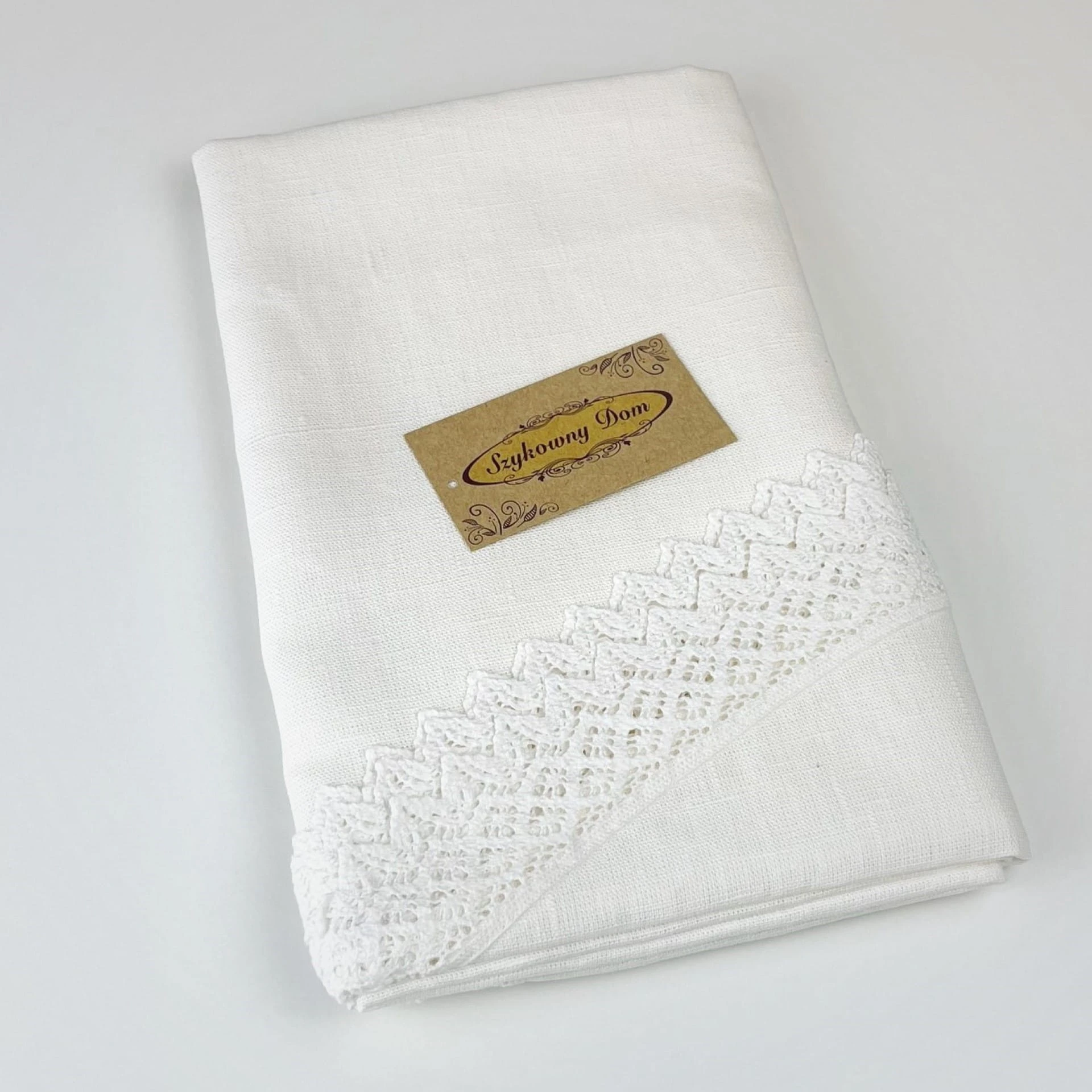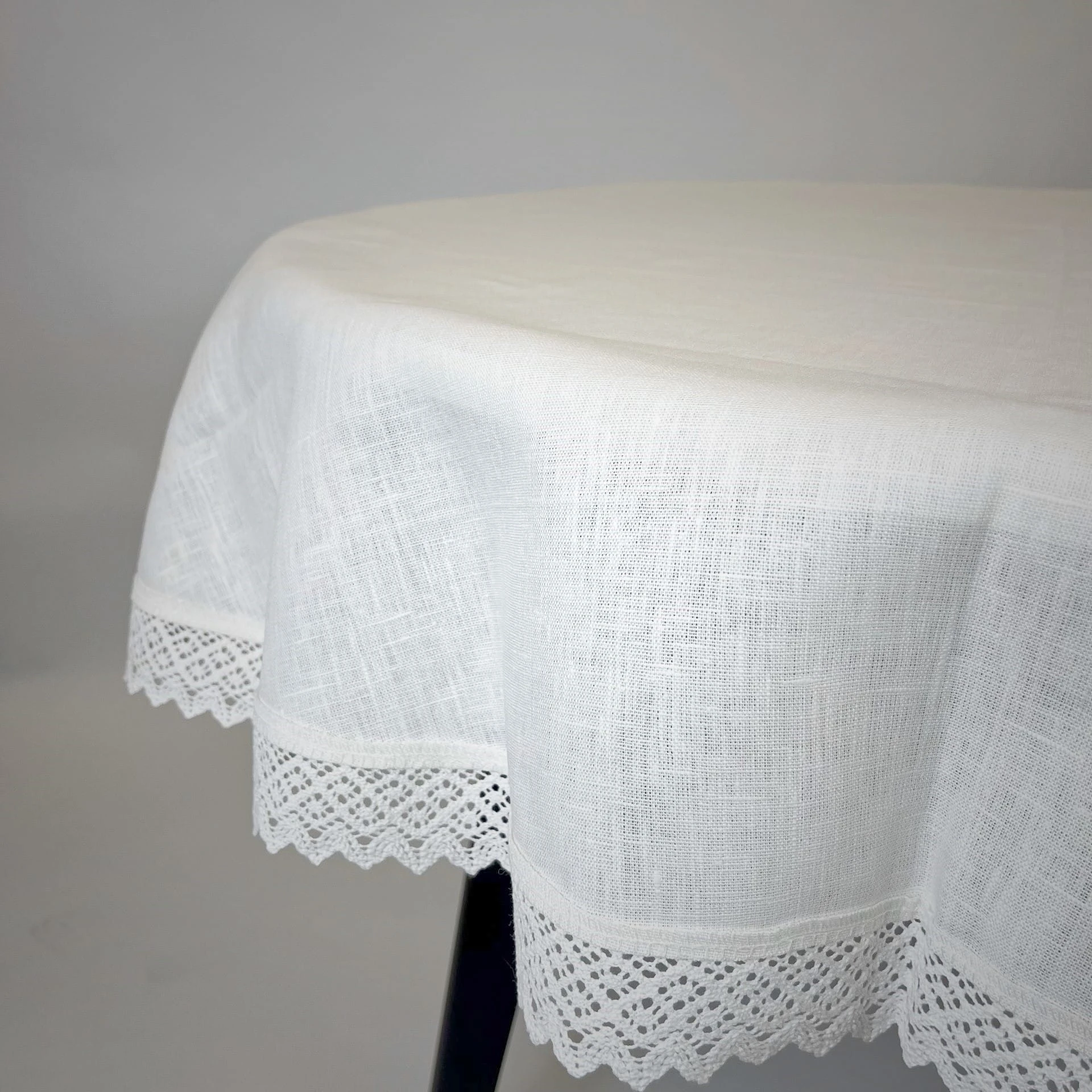 Obrus uszyty z grubej tkaniny lnianej, kolor ecru (opisywany jako śmietanka). Wykończony odpowiedniej grubości koronką bawełnianą. Cały wyrób jest bardzo elegancki, do położenia na okrągłym stole na ważne okazje. Obrusy w rozmiarach śr. 150 cm.