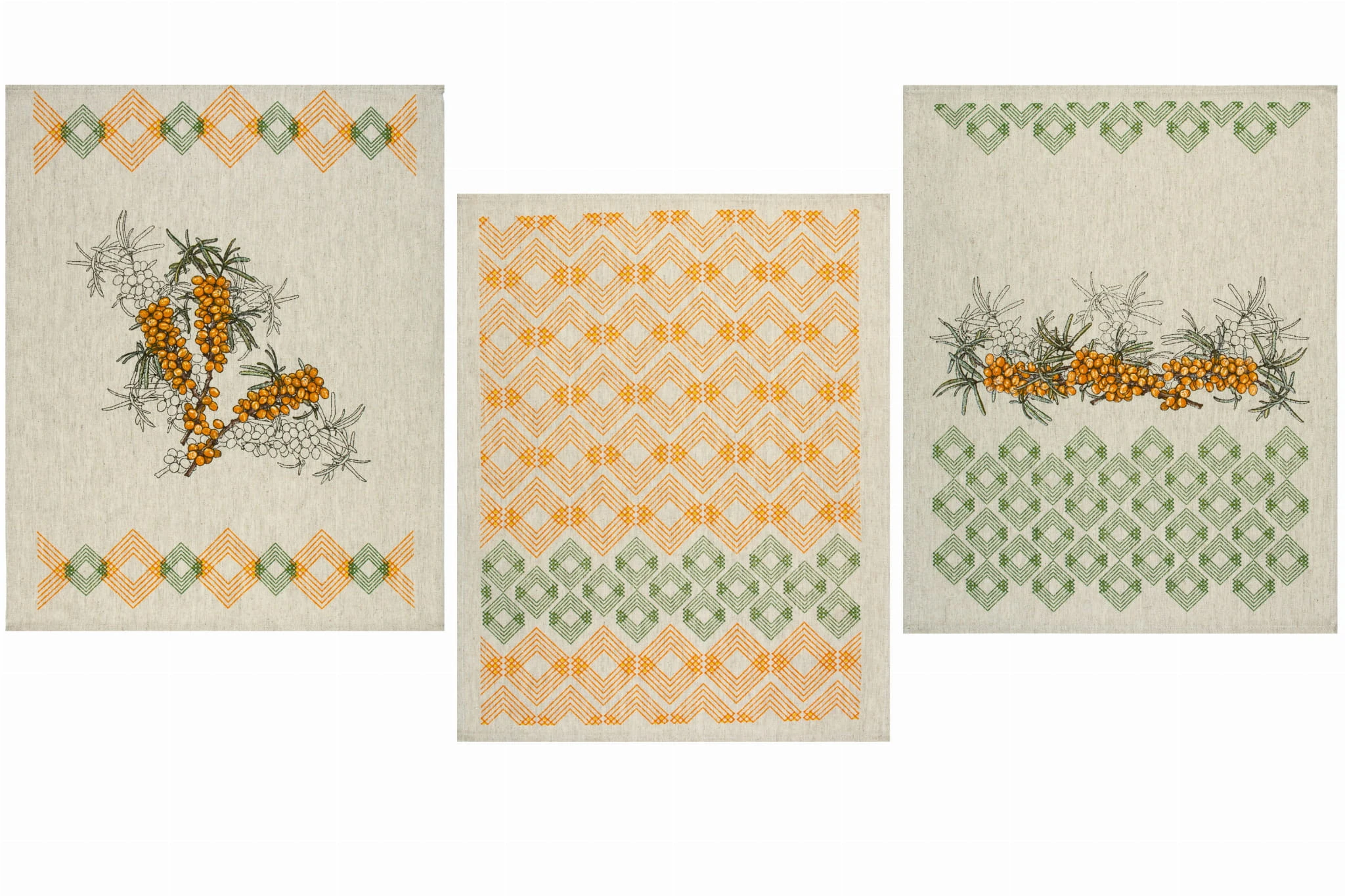Komplet ścierek „Rokitnik” to propozycja dla tych, którzy nie uznają kompromisów między estetyką a funkcjonalnością. Dzięki wysokiej zawartości lnu (aż 53%), tkanina posiada wyraźną, szlachetną strukturę i charakterystyczny chwyt, który z czasem staje się coraz bardziej miękki. Naturalny, beżowy odcień płótna stanowi idealne tło dla soczystego motywu rokitnika.